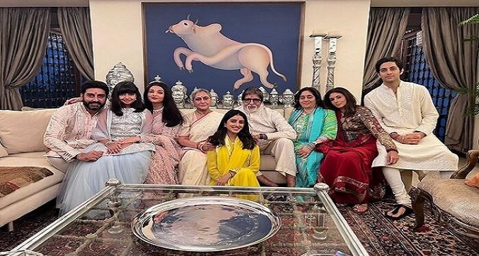 अमिताभ बच्चन ने सेलिब्रेशन की एक तस्वीर अपने आधिकारिक इंस्टाग्राम अकाउंट पर साझा की, जिसमें पूरा बच्चन परिवार एक ही फ्रेम में नजर आ रहा है। इस तस्वीर में अमिताभ बच्चन के साथ उनकी पत्नी जया बच्चन, बेटे अभिषेक बच्चन, बहू ऐश्वर्या राय, पोती आराध्या, नातिन नव्या नवेली नंदा, बेटी श्वेता बच्चन और नाती अगस्त्य नजर आ रहे हैं। इस दौरान सभी ट्रेडिशनल आउटफिट में नजर आ रहे हैं।