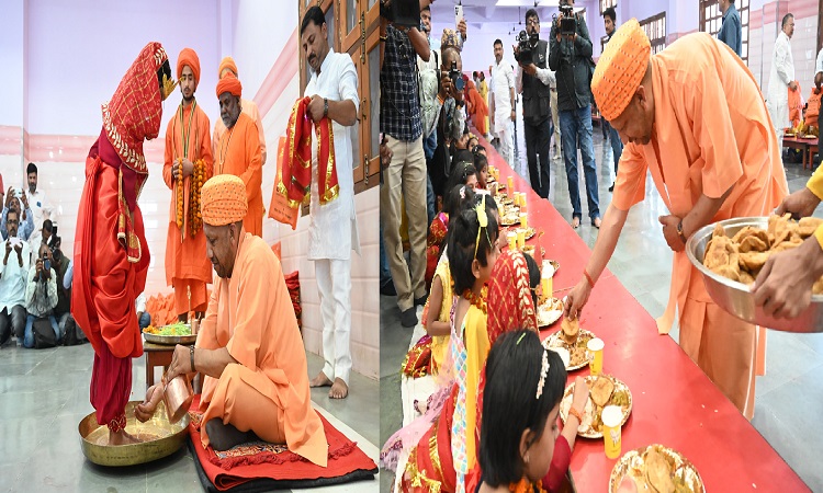 चैत्र नवरात्र की नवमी तिथि के अनुष्ठान में सीएम योगी (CM Yogi) एवं गोरक्षपीठाधीश्वर ने सबसे पहले कुंवारी कन्याओं के पांव धोये। उनके माथे पर रोली, चंदन, अक्षत आदि का तिलक लगाया। दुर्वा से उनका अभिषेक किया, माला पहनाई। चुनरी ओढ़ाकर एवं दक्षिणा प्रदान कर आशीर्वाद लिया। उन्होंने अन्न क्षेत्र में सभी कुंवारी कन्याओं व बटुकों की श्रद्धाभाव से आरती भी उतारी।
