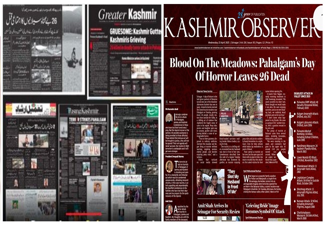 ‘ग्रेटर कश्मीर’, ‘राइजिंग कश्मीर’, ‘कश्मीर उजमा’, ‘आफ़ताब’ और ‘तैमील इरशाद’ जैसे प्रमुख अखबारों (Kashmir Newspapers) ने अपने पहले पन्ने को पूरी तरह काले रंग में प्रकाशित किया। इन अखबारों ने सफेद या लाल रंग में बड़े और संवेदनशील शीर्षक छापे, जो इस बर्बर कृत्य के खिलाफ सामूहिक शोक और आक्रोश को दर्शाते हैं।
